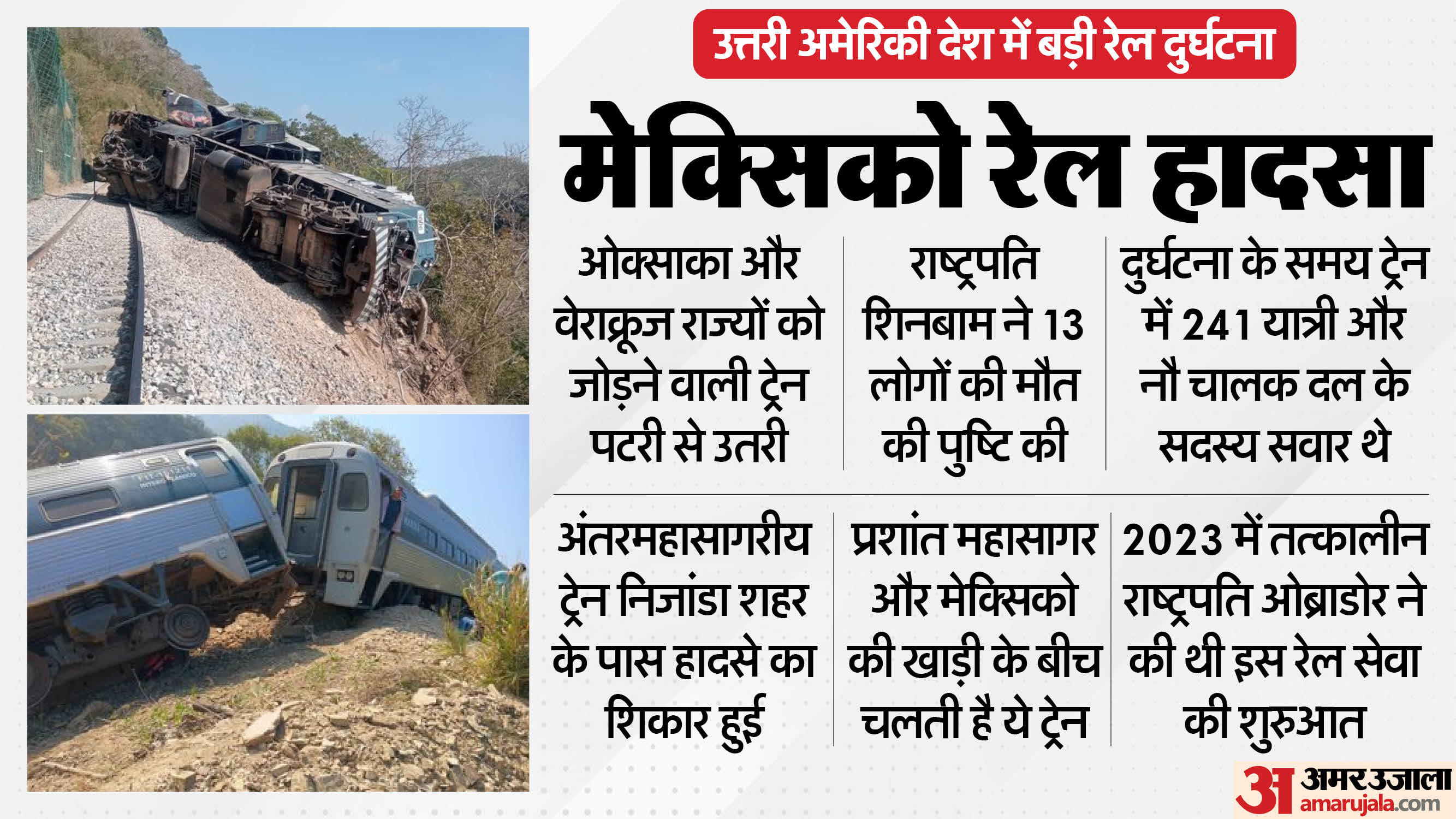 उत्तरी अमेरिकी देश- मेक्सिको में बड़ा रेल हादसा हुआ है। ट्रेन के डिब्बे पटरी से उतरने के कारण हुई इस दुर्घटना में 13 लोगों की मौत हुई है। 98 यात्रियों के घायल होने की खबर है। हादसे के बाद प्रशांत महासागर को मैक्सिको की खाड़ी से जोड़ने वाली रेल लाइन पर यातायात ठप हो गया। राष्ट्रपति शिनबाम ने हताहतों की मदद के लिए घटनास्थल पर सरकारी एजेंसियों को भेजने के निर्देश दिए हैं। जानिए इस हादसे से जुड़े अपडेट्स