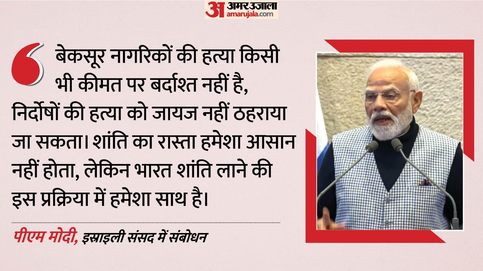 अपने संबोधन में पीएम मोदी ने कहा कि भारत ने भी लंबे समय तक आतंकवाद के दर्द को सहा है। हम 26/11 मुंबई हमलों को याद करते हैं, जिसमें कई निर्दोष लोगों की जान गई, जिनमें इस्राइली नागरिक भी शामिल थे। भारत की आतंकवाद के खिलाफ नीति भी हमेशा सख्त रही है और इसमें कोई दोहरापन नहीं है।