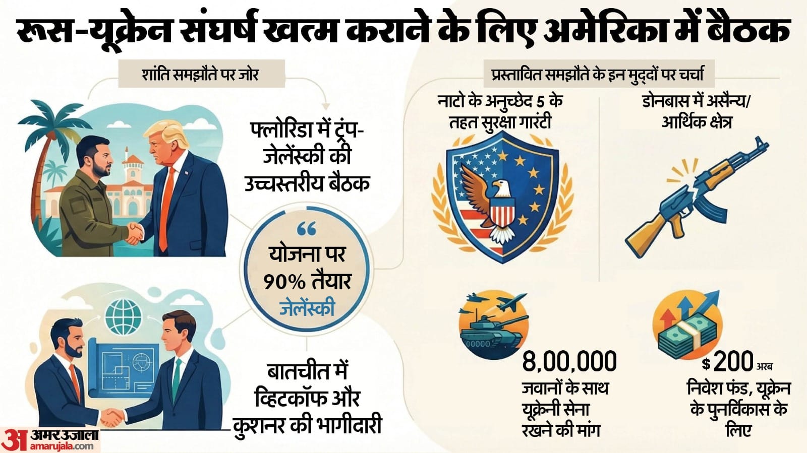 - जेलेंस्की ने घोषणा की है कि यह 20-सूत्रीय शांति योजना के 90 फीसदी बिंदुओं पर तैयार हैं। उन्होंने उम्मीद जताई है कि नए साल से पहले बहुत कुछ तय किया जा सकता है।