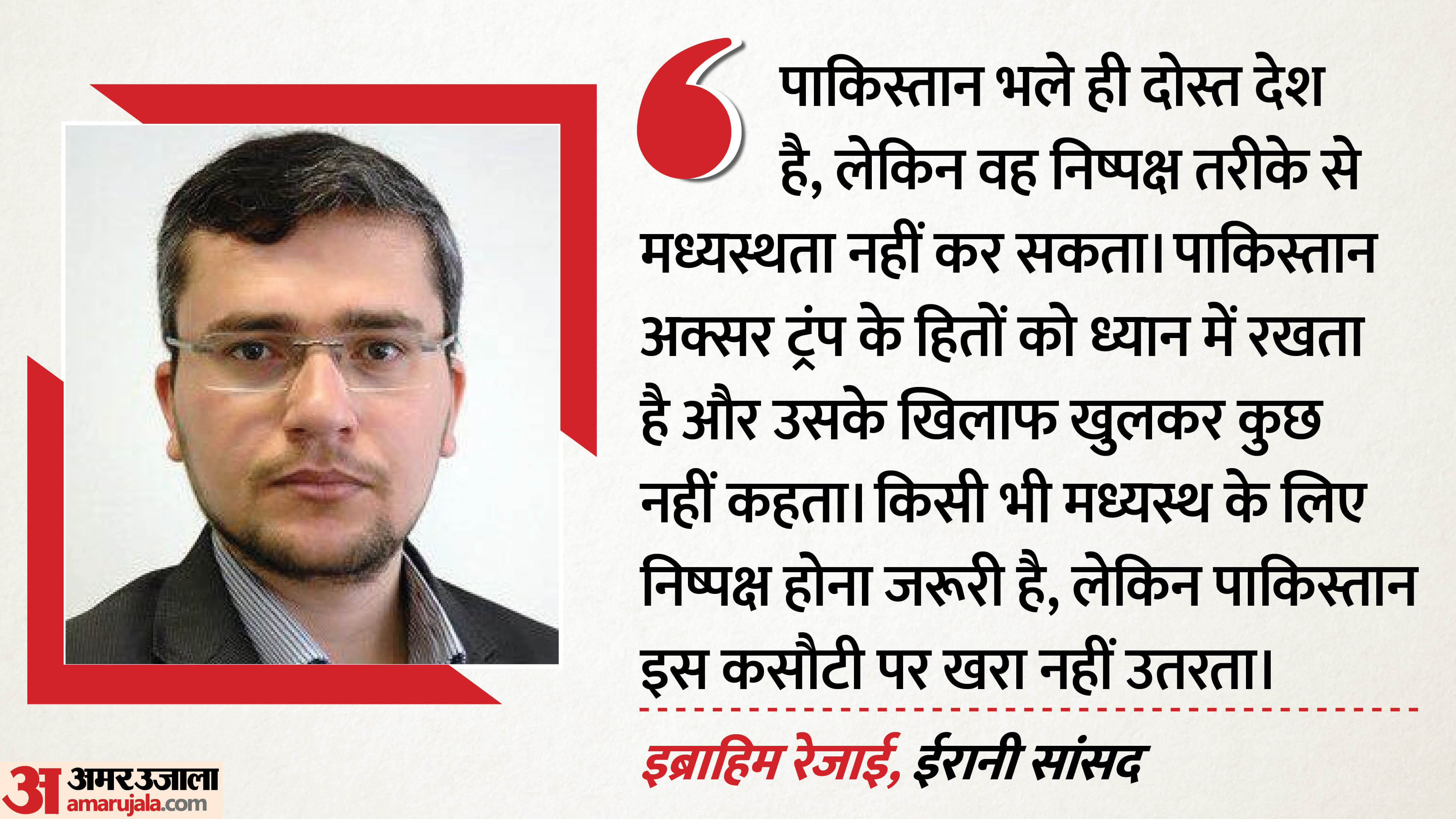 इसके अलावा ईरान के दशतेस्तान से सांसद इब्राहिम रेजाई ने पाकिस्तान को अमेरिका और ईरान के शांति वार्ता में अच्छा मध्यस्थ (मीडिएटर) नहीं माना है। उन्होंने सोशल मीडिया प्लेटफॉर्म एक्स पर एक पोस्ट में कहा कि पाकिस्तान भले ही ईरान का अच्छा दोस्त और पड़ोसी देश है, लेकिन वह बातचीत के लिए सही मध्यस्थ (मीडिएटर) नहीं है। रेजाई ने साफ कहा कि पाकिस्तान में निष्पक्ष मध्यस्थता के लिए जरूरी भरोसा और साख की कमी है। उनका आरोप है कि पाकिस्तान हमेशा डोनाल्ड ट्रंप और अमेरिका के हितों को ध्यान में रखता है और कभी भी उनके खिलाफ खुलकर कुछ नहीं कहता।