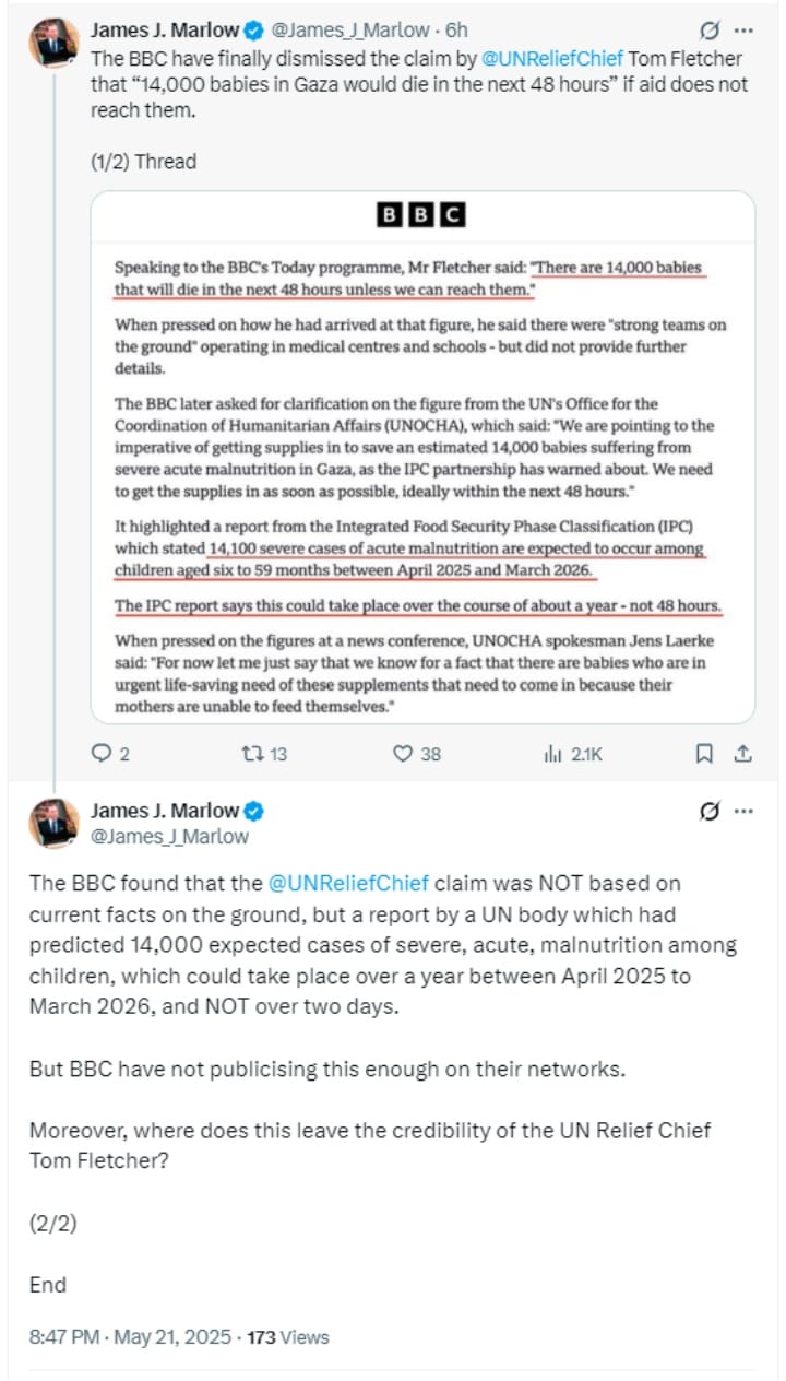 गाजा में संकट कितना गंभीर है, इसका अंदाजा उन मीडिया रिपोर्ट्स से लगाया जा सकता है, जिसमें संयुक्त राष्ट्र के मानवाधिकार प्रमुख टॉम फ्लेचर के हवाले से कहा गया है कि अगर मानवीय सहायता गाजा के प्रभावित लोगों तक नहीं पहुंची तो 48 घंटे के भीतर लगभग 14 हजार बच्चों की मौत हो सकती है। हालांकि, फ्लेचर के इस दावे पर मानवीय मामलों के समन्वय के लिए संयुक्त राष्ट्र कार्यालय (UNOCHA) के प्रवक्ता- जेन्स लार्के ने कहा है कि हजारों बच्चे ऐसे हैं, जो कुपोषण के शिकार हैं, और उन्हें तत्काल जीवन रक्षा मदद की जरूरत है।