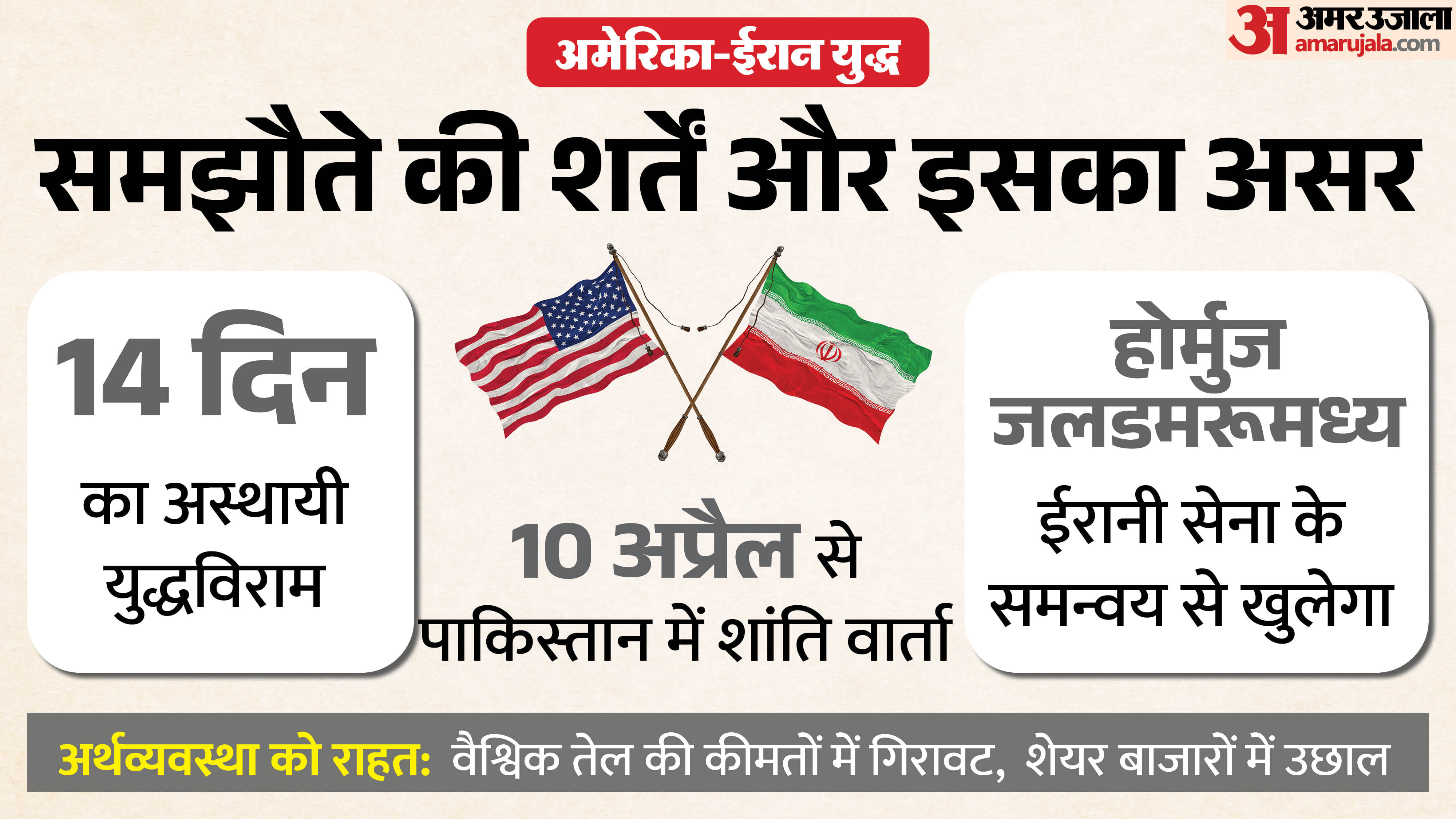 यह सीजफायर तत्काल रूप से होर्मुज जलडमरूमध्य को सशर्त खोलने और दोनों देशों द्वारा हमलों को 14 दिनों तक रोकने की शर्त पर लागू हुआ है, जबकि बाकी सभी बड़ी मांगों को आगामी वार्ताओं, जो पाकिस्तान में होनी हैं, के लिए छोड़ दिया गया है।
