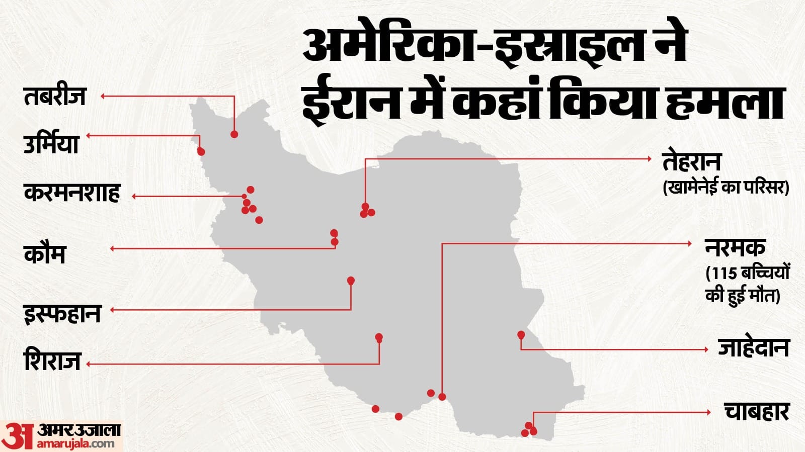 अमेरिका और इस्राइल ने ईरान के कई प्रमुख शहरों, सैन्य ठिकानों और राजनीतिक केंद्रों पर संयुक्त हमले किए हैं। जिन जगहों पर हमले हुए हैं, उनमें ईरान की राजधानी तेहरान सबसे ज्यादा प्रभावित हुई है।