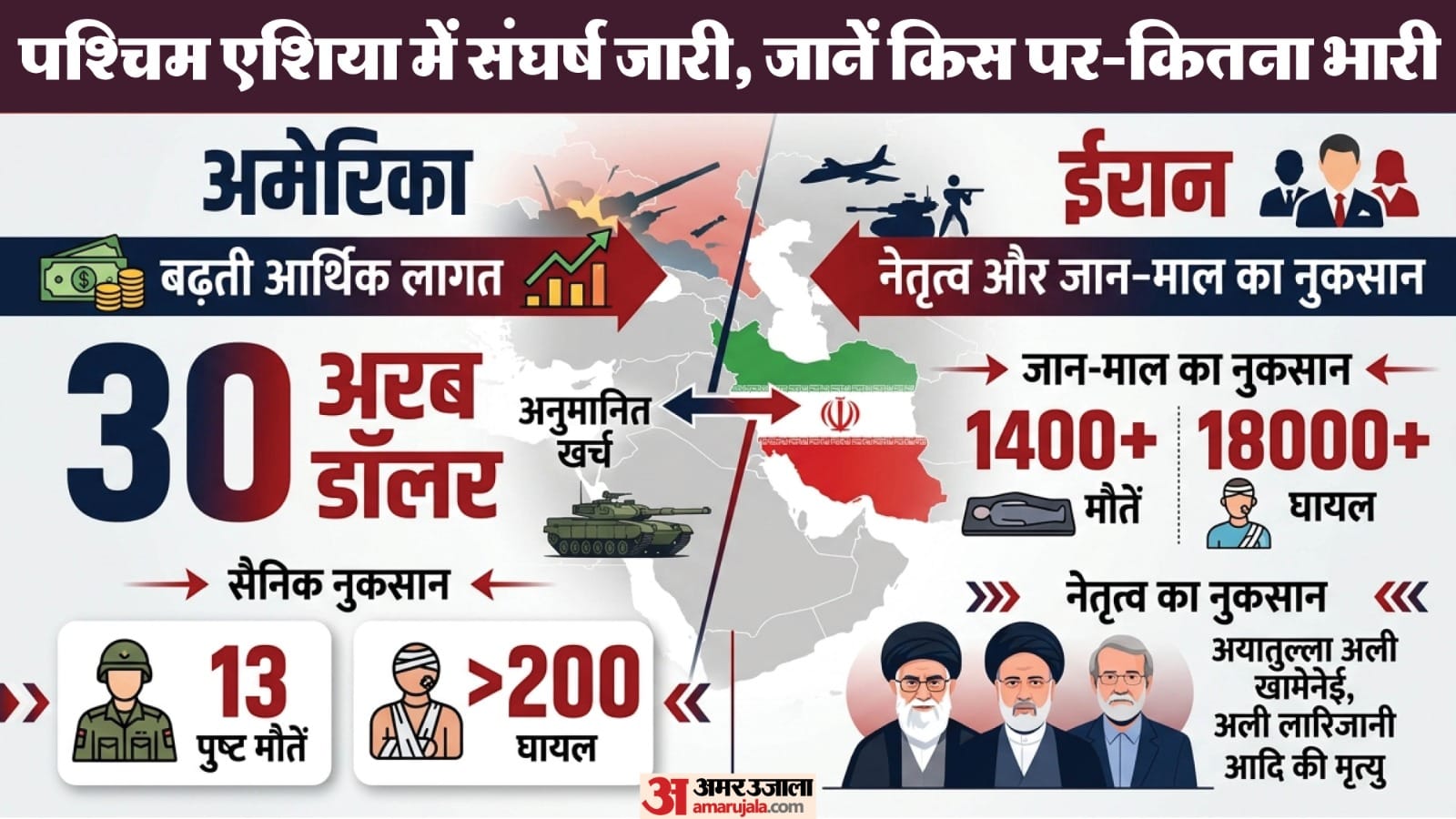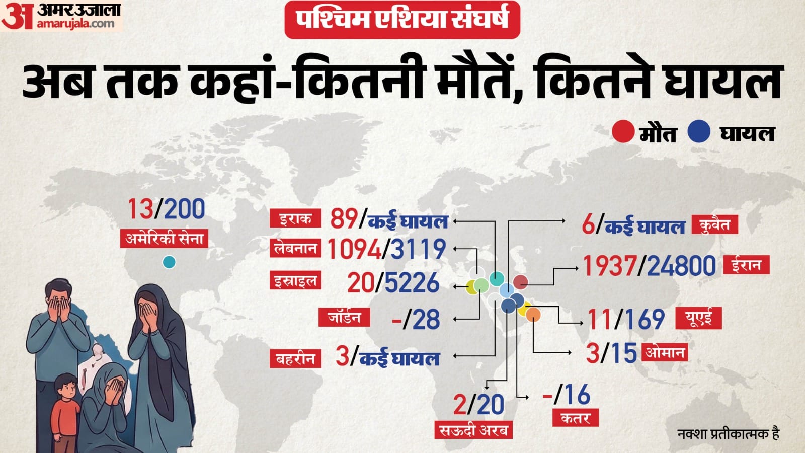 - पहले महीने के अंत तक ईरान में मरने वालों की संख्या 2,000 के करीब पहुंच गई। उधर खाड़ी क्षेत्र में 25 मौतें हुईं। इसके अलावा अमेरिका के 13 सैनिकों की मौत की बात सामने आई है, जबकि 200 से ज्यादा घायल बताए गए हैं।