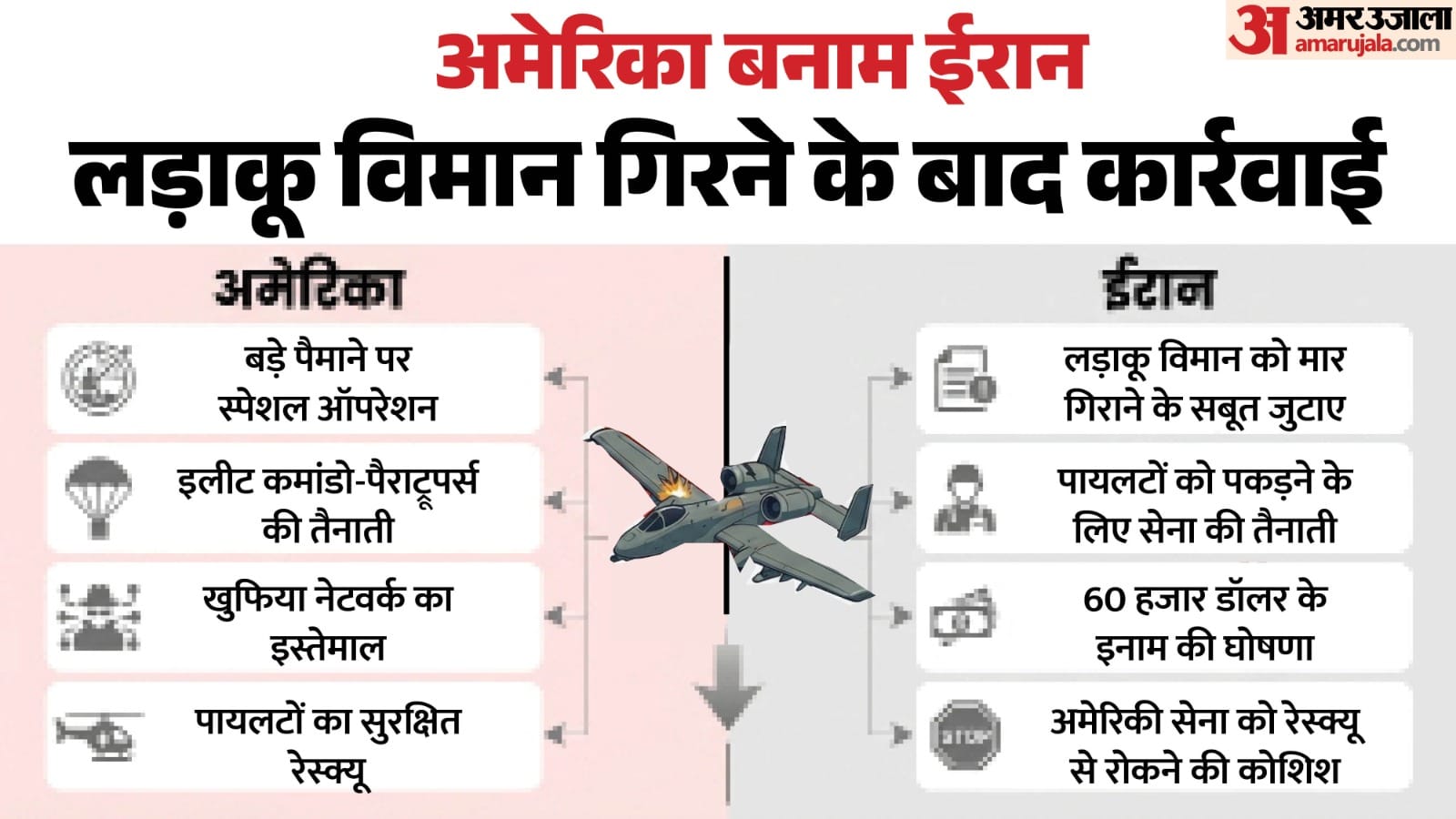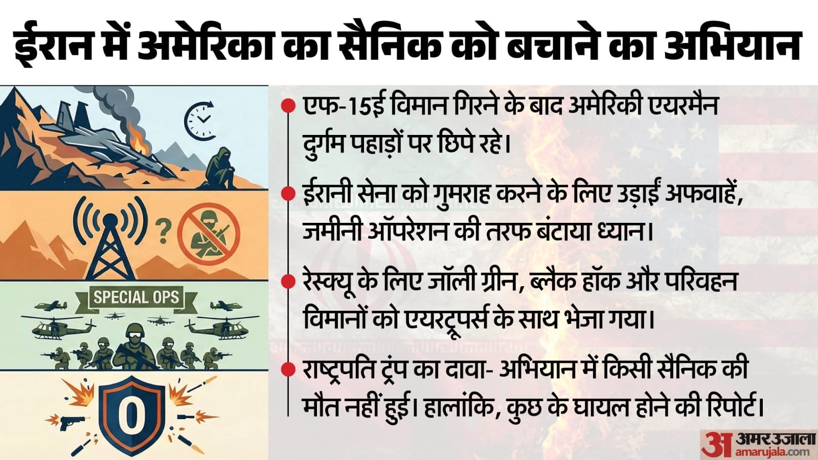 जवाब: इजेक्शन की अफरातफरी के दौरान एयरमैन, जिसकी पहचान कर्नल रैंक के अधिकारी के तौर पर हुई, वह मुख्य पायलट से अलग हो गया था। वह ईरान के क्षेत्र में अकेला था और उसके पास केवल एक पिस्तौल, अपनी बचाव किट, कुछ संचार उपकरण और एक लोकेशन बीकन था। द न्यूयॉर्क टाइम्स की रिपोर्ट के मुताबिक, यह एयरमैन दुर्घटना के बाद घायल हो गया था। इसके बावजूद वह ईरान की पकड़ से बचने के लिए 20 किलोमीटर चलते हुए जग्रोस पहाड़ों पर 7,000 फुट ऊंची चोटी पर चढ़ गया। यहां उसने पहाड़ी दरार में खुद को छिपा लिया और बीच-बीच में अपने लोकेशन बीकन के जरिए कमांड बेस को सिग्नल भेजता रहा।सवाल-5: शुक्रवार और शनिवार को इस लापता अधिकारी को बचाने के लिए क्या-क्या हुआ?