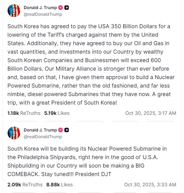 ट्रंप और दक्षिण कोरियाई राष्ट्रपति ली जे म्यंग की बैठक के बाद हुई पनडुब्बी की घोषणा के अलावा अमेरिकी राष्ट्रपति ने ये भी कहा कि टैरिफ घटाने के लिए कोरिया ने 350 अरब डॉलर का भुगतान करने की बात कही है। उन्होंने ट्रुथ सोशल पर लिखा, 'दक्षिण कोरिया ने अमेरिका की तरफ से लगाए गए टैरिफ़ को कम करने के लिए अमेरिका को 350 अरब डॉलर का भुगतान करने पर सहमति जताई है। इसके अतिरिक्त, वे भारी मात्रा में हमारा तेल और गैस खरीदने पर भी सहमत हुए हैं।'