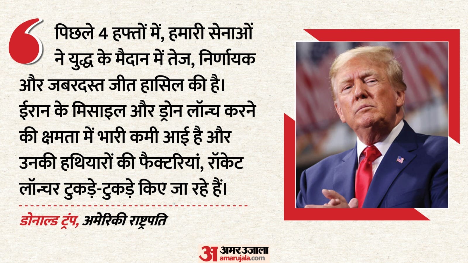 ट्रंप ने कहा कि पिछले चार हफ्तों में, हमारी सेनाओं ने युद्ध के मैदान में तेज, निर्णायक और जबरदस्त जीत हासिल की है, ऐसी जीत, जो बहुत कम लोगों ने पहले कभी देखी होगी।' ट्रंप ने कहा 'उनके मिसाइल और ड्रोन लॉन्च करने की उनकी क्षमता में भारी कमी आई है और उनकी हथियारों की फैक्टरियां, रॉकेट लॉन्चर टुकड़े-टुकड़े किए जा रहे हैं; अब उनमें से बहुत ही कम बचे हैं। युद्ध के इतिहास में पहले कभी किसी दुश्मन को, महज कुछ ही हफ्तों के भीतर, इतने स्पष्ट और विनाशकारी बड़े पैमाने पर नुकसान नहीं उठाना पड़ा है।'