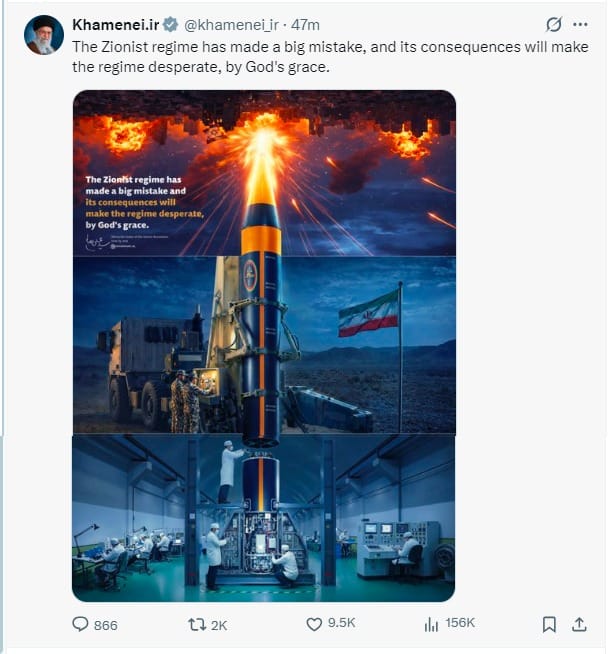 एक्स पोस्ट में एक मिसाइल का वीडियो दिखाया गया है, जिसमें उसकी तैयारी से लेकर इस्तेमाल तक के सभी चरण दिखाए गए हैं। इसमें वैज्ञानिकों को मिसाइल बनाते हुए, सैन्यकर्मियों को उसे लॉन्च करते हुए और आखिर में उसे लक्ष्य पर हमला करते हुए दिखाया गया है। पोस्ट में लिखा गया, इस (जायनिस्ट शासन) के परिणाम उस शासन को निराश कर देंगे, इंशाअल्लाह।